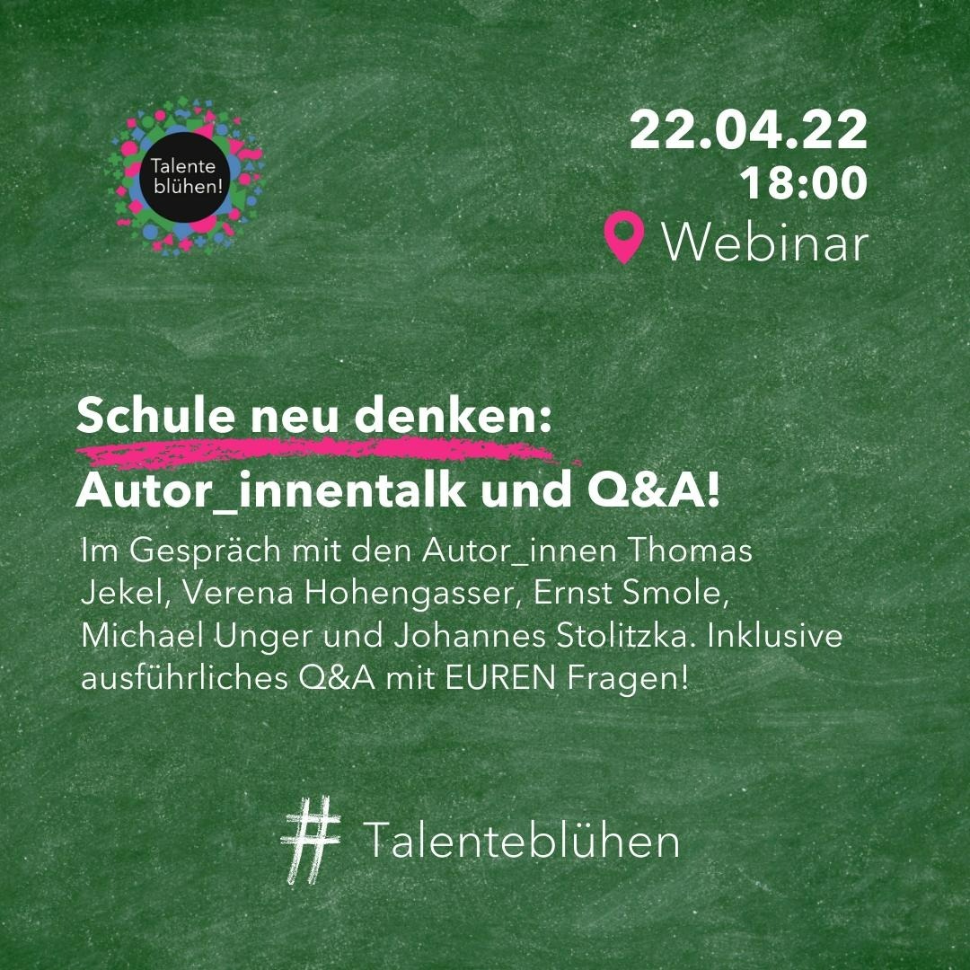 Nach einem erfolgreichen Launch der neuen Talente blühen!- Publikation "Schule neu denken - Schluss mit der Stundenplanwirtschaft" wollen wir nun mit den Autor_innen der Publikation über die Inhalte im Detail sprechen. Im Zentrum werden die Fragen des Publikums über ein Zoom Webinar stehen.